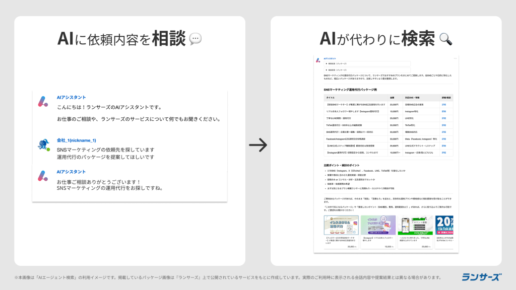 本機能は、最新のAI技術であるMCP(Model Context Protocol)とRAG(Retrieval-Augmented Generation)(※2)を用いることで、会話の文脈に応じた柔軟な応答と正確性・最新性の高い情報提供を可能にしました。発注者のプロフィール情報や会話内容をもとに、AIが名前を呼びかけながら応答するなど、パーソナライズされた対話体験を提供します。「AIエージェント検索」は、単なる検索機能にとどまらず、専属アシスタントのように『ランサーズ』での発注体験をサポートします。