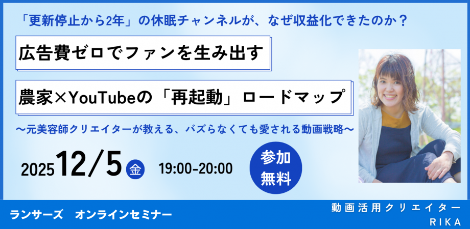 本ウェビナーでは、更新停止から2年間休眠状態だった農家チャンネルを、わずか数ヶ月で収益化・登録者3000人規模へと再起動させた具体的なロードマップを徹底解説します。