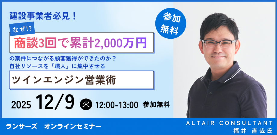 建設業界はもちろん、専門性が高く営業リソースが不足しがちな製造業・BtoBサービスの経営者様にとっても、目から鱗のノウハウが詰まった1時間です。