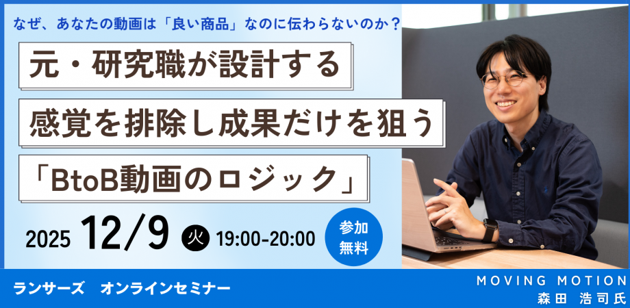 感覚やセンスに頼らず、ロジックに基づき、貴社の優位性を徹底的に言語化・映像化するランサーズの真のプロフェッショナルが、中小企業の限られた予算で確実に成果を出すBtoB動画制作の裏側を、惜しみなく公開する無料ウェビナーを開催します。