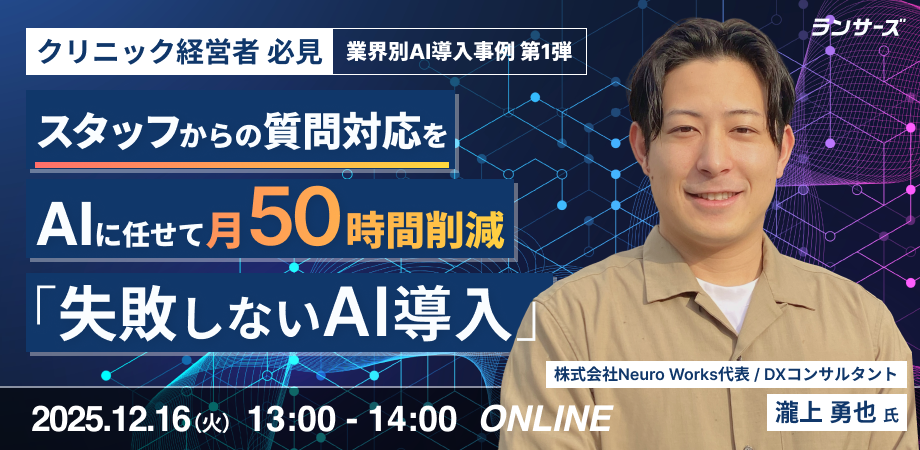 本ウェビナーでは、クリニック・不動産・介護など様々な業界でAIの導入支援をされた 株式会社 Neuro Worksの瀧上氏にご登壇いただきます。