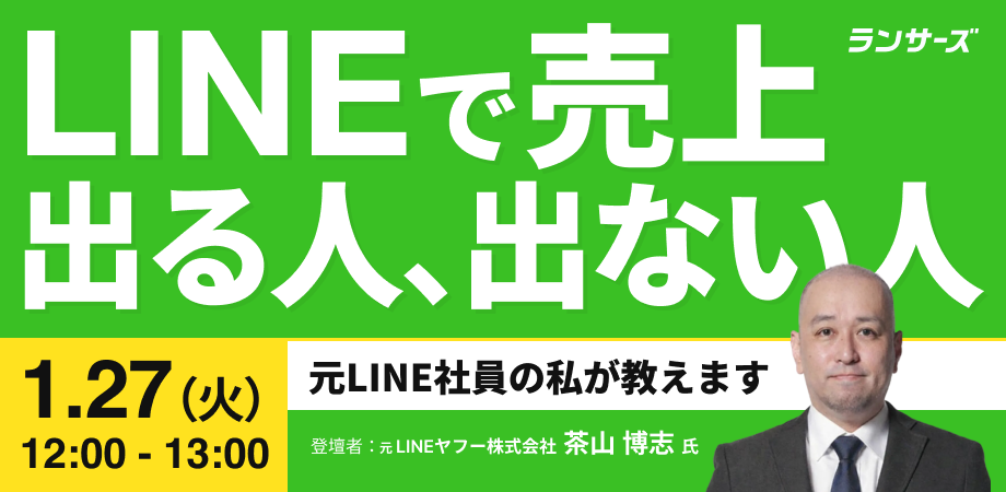 LINE社に7年間在籍し、1万社以上の企業と関わってきた茶山博志氏が、実際に売上を伸ばした企業が実践しているノウハウを本ウェビナーで徹底解説します。