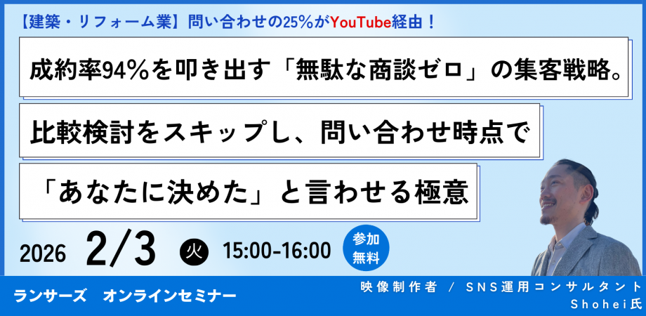 「YouTubeは再生数を稼ぐためのエンタメではない」 そう断言するShohei氏は、建築業界の現場を知り尽くしたプロの視点で、問い合わせが来た時点で「あなたにお願いしたい」と指名される「ショールーム型YouTube導線」を確立。実際に1年半で問い合わせの25%をYouTube経由にし、商談に上がればほぼ確実に成約する(成約率94%)という「勝ちパターン」を生み出しました。
